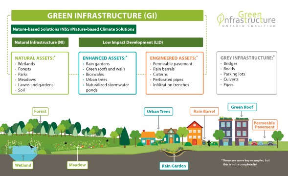Natural assets are the components of natural heritage systems. They include forests, wetlands, meadows, parks, trees, and watercourses. Natural assets fall under the broader umbrella of green infrastructure. (Figure 1)