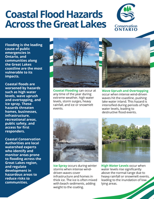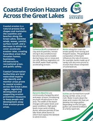 Conservation Ontario’s funded Adapting to Coastal Hazard Across the Great Lakes Project is partnered with Conservation Authorities, who are undertaking three pilot projects on Northern Lake Superior, Southern Lake Huron and Western Lake Ontario. These pilot projects will assess the social, environmental, and economic impacts of coastal hazards and climate change and will engage municipal and community partners, businesses and Indigenous groups. This project will support Conservation Ontario’s capacity to provide support to the Conservation Authority Coastal Network in delivering their mandate for managing coastal hazards as local partners across the entire Great Lakes Region.